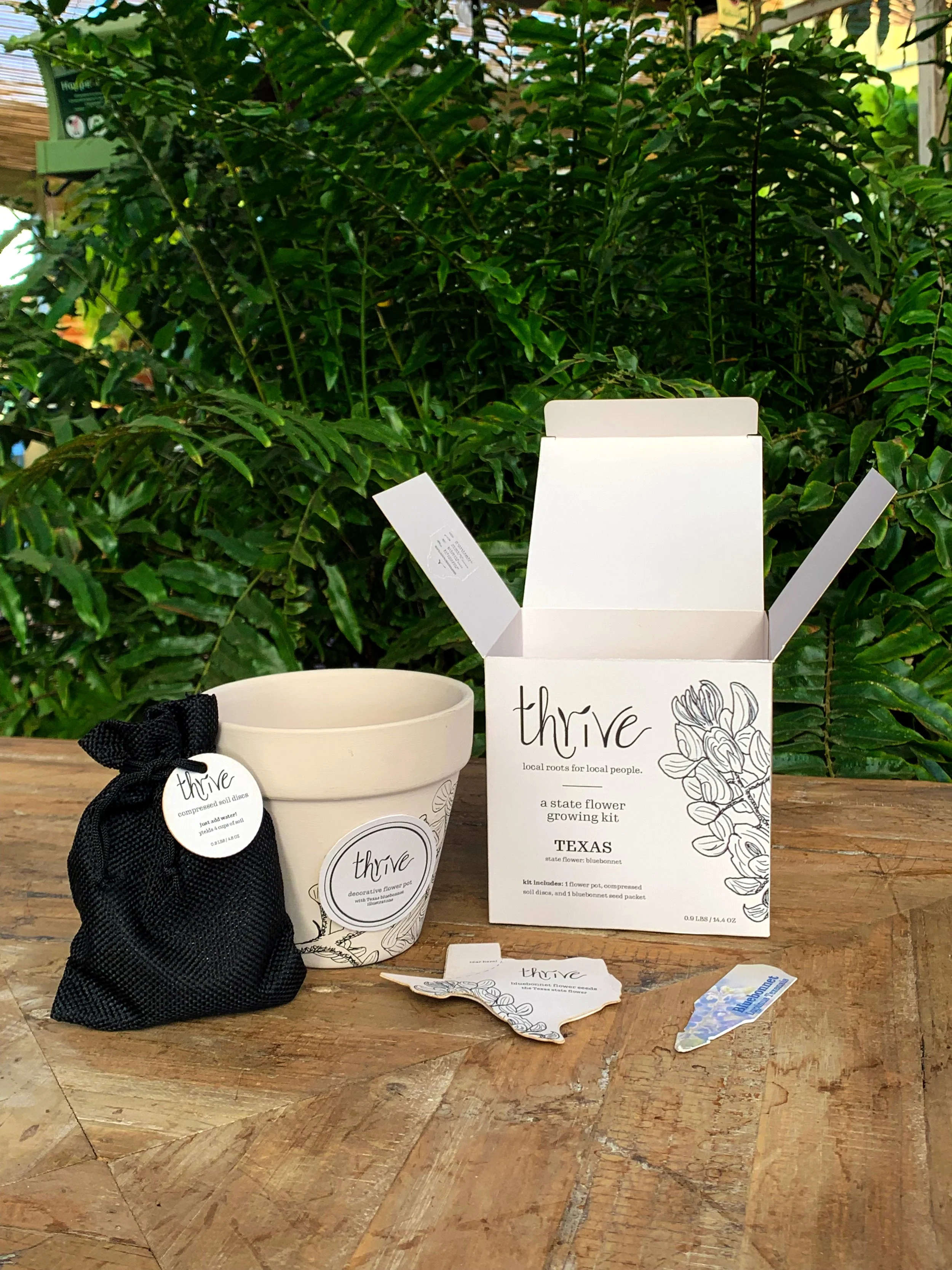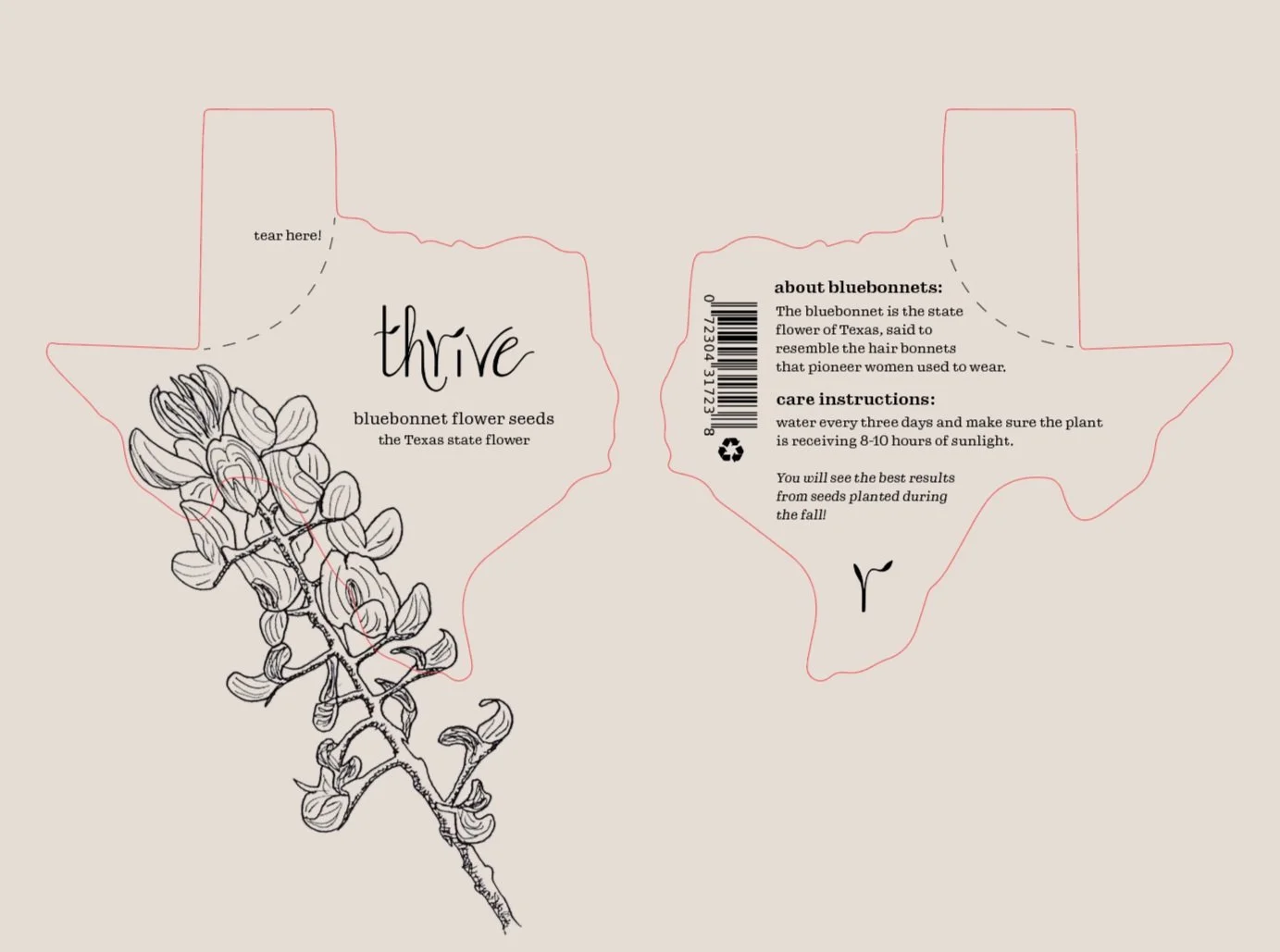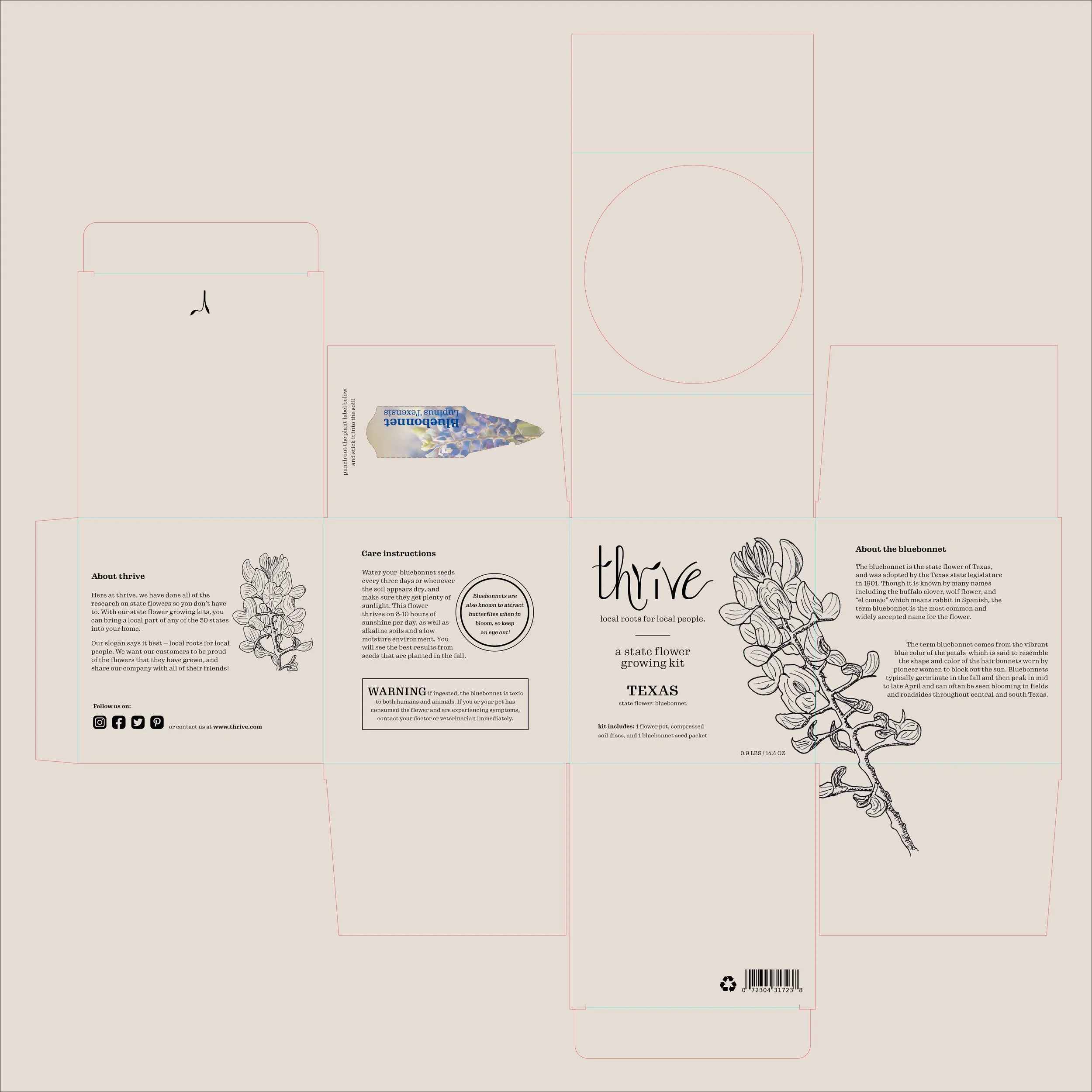 Concept: Thrive is a company that manufactures growing kits for the different state flowers. The kit includes seeds, soil, and a decorative pot with custom illustrations. Thrive hopes to teach local residents about their state flower, while also allowing them to take it home and watch it thrive. Deliverables for this project included logo with hand drawn typography, custom flower illustrations and physically produced items – box, seed packet, label, tag and soil insert.